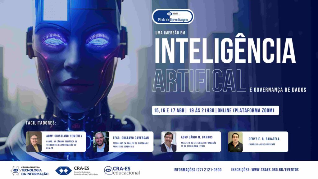 O curso será conduzido por especialistas com atuação consolidada nas áreas de Administração e tecnologia. Entre os instrutores estão o administrador Cristiano Hemerly (CRA-30431), especialista em gestão de tecnologia e coordenador da Câmara Temática de Tecnologia da Informação do CRA-ES; o tecnólogo Gustavo Caversan (CRA-31179), profissional com mais de duas décadas de experiência em implantação de sistemas analíticos e projetos de Business Intelligence; o administrador Jânio Moreira Barros (CRA-9573), especialista em engenharia de software e analista de sistemas da Fundação Espírito-Santense de Tecnologia (FEST); e Denys Emanuel Bacchetti Baratela, administrador e especialista em estratégias de growth e aplicação de inteligência artificial em negócios digitais